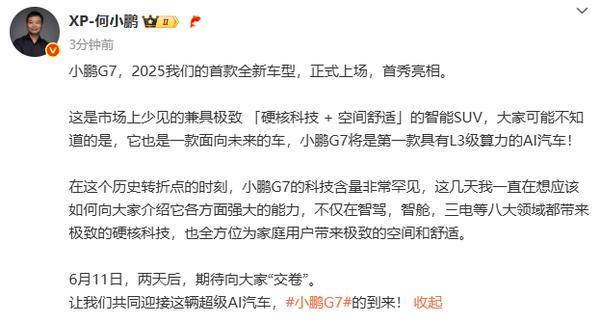 小鹏汽车董事长何小鹏于近日揭晓了一项重大消息,公司旗下的全新战略车型小鹏G7即将在6月11日迎来全球首次亮相。这款被定义为“超级AI汽车”的智能SUV,被小鹏官方自豪地称为首款集L3级自动驾驶算力与家庭舒适体验于一身的车型。